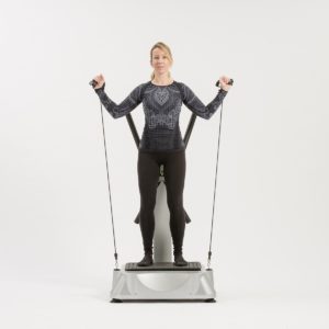 This exercise works the upper body, being effective in strengthening the shoulders, arms and upper back muscles. However, given that you’re standing on a vibration platform, the legs also get a nice workout. Place your feet at #2 and do classical shoulder raises for 1 minute, exercising at 12Hz.