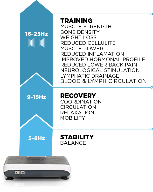 The vibrating platform moves you up and down, a few millimetres at a time with carying speeds. As it does this there are three main effects on your body.